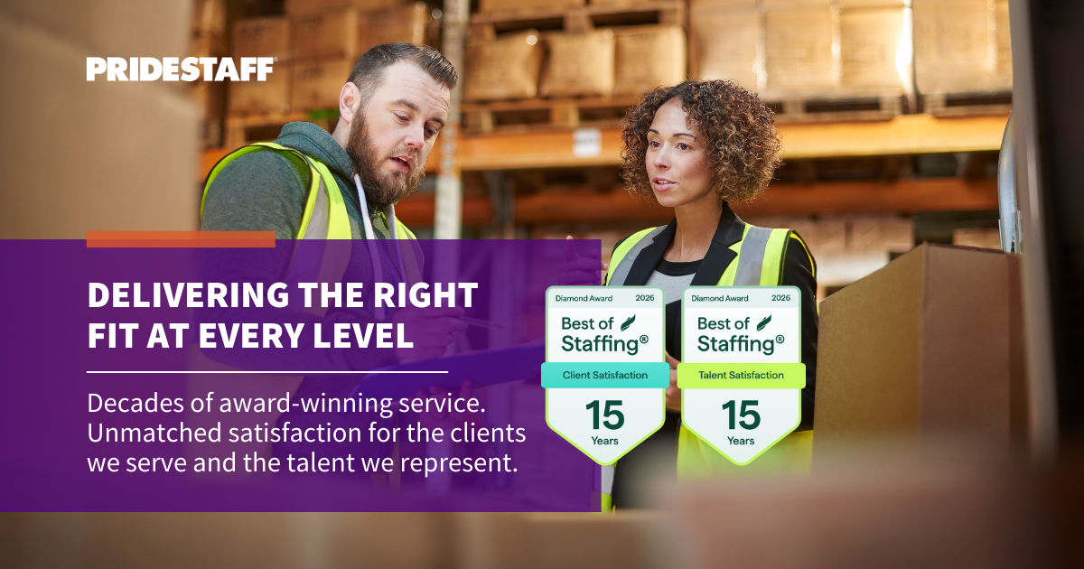 In 2026, PrideStaff received satisfaction ratings and Net Promoter® Scores that were nearly 2 times the industry average. As the only nationwide commercial staffing firm with $100 million or more in annual revenue to earn ClearlyRated’s Best of Staffing 15-Year Diamond Awards for Client and Talent satisfaction, PrideStaff continues to demonstrate an unmatched ability to deliver results that clients and candidates value most.